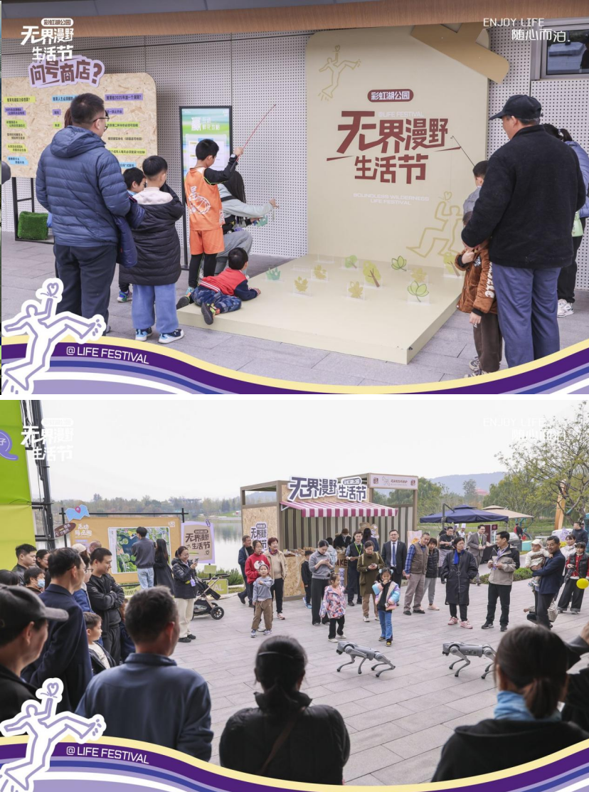 創意打造的互動活動,巧妙構建起人與場景的情感連接。“問號商店”與“趣味垂釣”兩大互動游戲裝置,讓人們在一貼一答間觸發思考,完成與自我的對話,在一釣一獲中體驗樂趣,盡享童真野趣;另一邊,智能機器狗的到來,為自然場域注入鮮活科技感,展現科技與野趣的別樣融合。趣味活動共同編織出層次豐富的漫野體驗,讓創意、趣味與自然之美,在親身參與中悄然流轉。